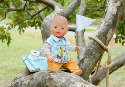 Ein Outfit wie gemacht für coole Puppenjungs! Diese Bekleidung im Lagen-Look besteht aus einem schlichten grauen Longsleeve, darüber ein schickes hellblaues Poloshirt und dazu eine passende orangefarbene Hose in Jeansoptik!