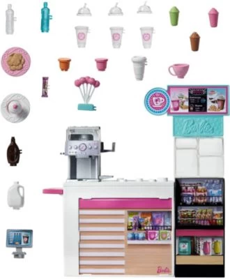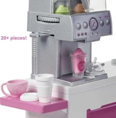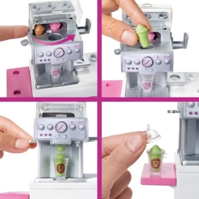 Mit Barbie und dem Naschcafé Spielset lernen Kinder, wie es ist, ein Geschäft zu führen! Genau das Richtige für Kaffee- und Frappé-Liebhaber. Das Barbie Naschcafé Spielset enthält eine Barbie-Puppe mit einem niedlichen schwarz-weiß gestreiften T-Shirt-Kleid und einer pinkfarbenen Schürze. Genau das Richtige für ein Kind, das gerne Kaffee zubereiten, Essen servieren und backen möchte!