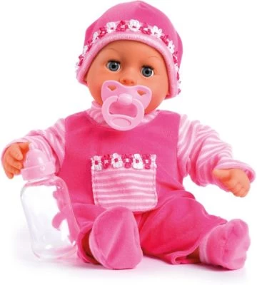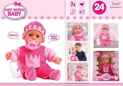 Die süße ca. 38 cm große Puppe hat 24 Funktionen und ein niedliches Gesicht. Drückt man ihr auf das Bäuchlein lacht sie, weint sie, sagt Mama und Papa und gibt verschiedene Babygeräusche von sich.