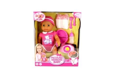 Wenn man Piccolina Newborn Baby ihre Flasche mit Wasser gibt, macht sie Pipi in ihr Töpfchen.Magic Potty besitzt einen Spülsound, sobald man auf den Knopf drückt.Legt man die Babypuppe schlafen, so schließt sie ihre Augen.Piccolina Newborn Baby trägt einen niedlichen Body mit passendem Mützchen.Arme und Beine lassen sich leicht bewegen, damit ist Baby Lisa bestens für Rollenspiele geeignet.Im Set ist auch ein magic Potty, Fläschchen, Schnuller, Teller mit Essbesteck und eine Windel enthalten.