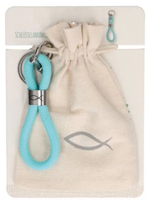 Der modische Schlüsselanhänger aus robustem türkisem Seemannsgarn ist der perfekte Helfer im Alltag. Er bietet Platz für Schlüssel, USB-Sticks, Charms oder andere Dinge, die man bei sich tragen möchte. Für die sichere Befestigung sorgt ein hochwertiges Verbindungsstück aus Edelstahl. Die feine Fischgravur vermittelt Schutz und Segen und macht diesen Begleiter zu einem ganz besonderen Geschenk für verschiedene Gelegenheiten, Z.B. Kommunion, Konfirmation oder Firmung.