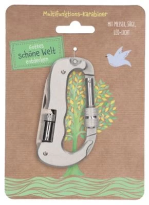Für große und kleine Abenteuer in der Natur4 Funktionen in einem Werkzeug: Karabinerhaken, Taschenmesser, Säge und LED-Licht.Dieser Multifunktions-Karabiner ist die optimale Grundausstattung für jeden kleinen Abenteurer und Naturentdecker!Der Karabinerhaken kann ganz leicht an Hose, Gürtel, Rucksack oder Schlüsselbund befestigt werden und ist so immer in Reichweite. Mit den vielen praktischen Verwendungsmöglichkeiten ist er der ideale Begleiter für unterwegs – egal ob beim Wandern, Angeln, Zelten oder anderen spannenden Outdoor-Erlebnissen in Gottes schöner Welt.