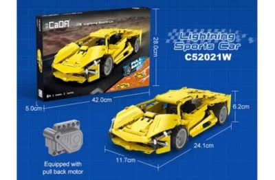 Aufbauen – nach Hinten ziehen – ab geht die Fahrt!Die Kombination aus Klemmbausteinen und Pull-Back-Motormachen dieses Set aus dem Hause CADA zu etwas ganz Besonderem. Ob Aufbau nach Anleitung oder freie Konstruktion -mit dem enthaltenen Pull-Back-Motor erfährst du mit deinemModell aus Klemmbausteinen echten Spielspaß.Maßstab: 1:18Altersgruppe: 6+Lieferumfang- 1x Baukasten „Lightning Sport Car Pullback (357 Teile)“- 1x Pullback-Motor- 1x Bauanleitung