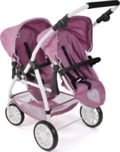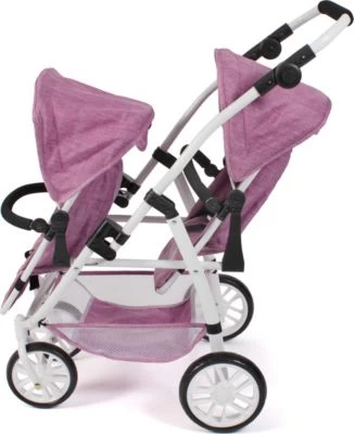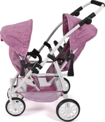 Moderner CHIC 2000 Zwillings-Sportwagen mit zwei abnehmbaren und bis in die Liegeposition verstellbaren Sportsitzen, die beide sowohl in Fahrrichtung wie auch mit Blick zu den Puppeneltern aufgesetzt werden können oder auch Face to Face. Daraus ergibt sich eine Vielzahl an Kombinationsmöglichkeiten. Kurven fahren wird zum Kinderspiel aufgrund der schwenkbaren Vorderräder.