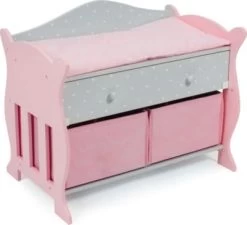 Die aus Holz hergestellte Kommode ist in dezentelm rosa mit grau/weißen Akzenten gestaltet. Die gelolsterte Wickelauflage ist ebenso wie die beiden herausnehmbaren Stoffkörben gestaltet. Die durchgängige große grau-weißgepunktete Tür kann aufgeklappt werden.