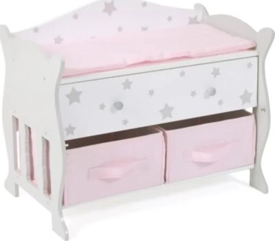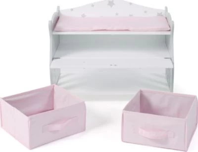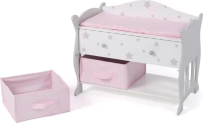 Die topmoderne CHIC 2000 Wickelkommode ist für Puppen bis ca. 46 cm Größe geeignet und erleichtert Puppeneltern das Wickeln ihrer Lieblinge. Die Wickelkommode ist komplett ausgestattet mit einer gepolsterten Wickelauflage, einer großen Schublade und zwei herausnehmbaren Staufächern mit viel Platz. So können alle benötigten Accessoires prima verstaut werden und sind bei der Puppenpflege griffbereit.