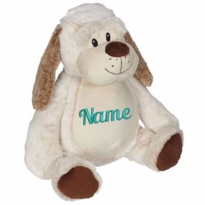 • Die personalisierte Stickerei erfolgt auf den Bauch des Hundes und macht das Kuscheltier zum Unikat