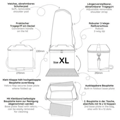 • Die ausklappbare Spielplatte (19.1 x 25.5cm) ist kompatibel mit den Sets der meisten Bausteinmarken großer Größe wie z.B. Lego Duplo. Eine extra Spielplatte ist bei der XL-Tasche in einem eigenen Fach verstaut.