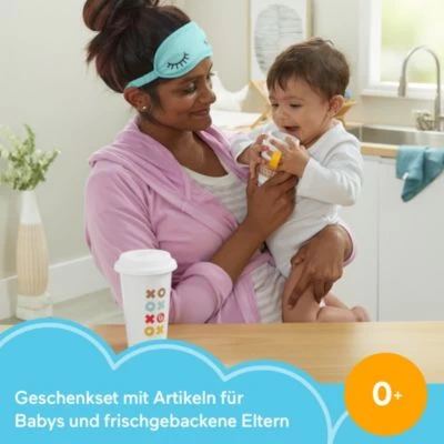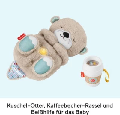 Das Geschenkset von Fisher-Price ist das ideale Präsent zur Geburt: Die Spieluhr Schlummer-Otter und eine Beißhilfe begeistern den Nachwuchs. Eine Schlafmaske und ein Getränkebecher erfreuen die Großen. Fisher-Price Schlummer-Otter Geschenkset Spieluhr Schlummer-Otter inkl. Testbatterien (4 x AA), Beißhilfe mit Rassel, Schlafmaske und Getränke-Becher Otter mit 30 Minuten Musik, Geräuschen, Licht und Atembewegungen Otter und Schlafmaske aus Textil, Getränkebecher aus Keramik und Silikon, Beißhilfe aus Kunststoff Spieluhr ab Geburt geeignet, Beißhilfe ab 3 Monaten geeignet, Getränkebecher und Schlafmaske nur für Erwachsene geeignet (kein Spielzeug) Das Geschenkset von Fisher-Price erfreut die ganze Familie. Der niedliche, etwa 25 Zentimeter große Otter unterstützt den Nachwuchs beim Einschlafen. Er spielt bis zu 30 Minuten Musik und Geräusche ab, macht Licht und Atembewegungen. So fühlen sich die Minis an der Seite des Kuscheltiers geborgen und sicher. Die Beißhilfe im coolen Kaffeebecher-Design lädt zum ausgiebigen Erkunden ein. Für die Erwachsenen hält das Set eine Schlafmaske für die Nacht bereit. Ihren Morgenkaffee können sie aus dem mit einem Silikondeckel ausgestatteten Keramikbecher genießen. Bitte achte darauf, dass Dein Kleines nicht mit der Maske und dem Becher spielt, diese Set-Teile sind kein Spielzeug und ausschließlich für Erwachsene geeignet.