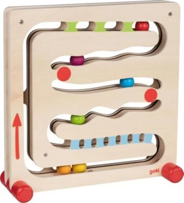 Und los geht die wilde Verfolgungsjagd! Aber vorher fahren bei der „Kugelbahn“ von goki die kleinen Kugeln mit dem „Fingerfahrstuhl“ an den Start. Dann sausen die kleinen kunterbunten Holzkugeln innerhalb der Bahn über die verschiedenen Rampenverläufe wieder nach unten. Die Bahn ist so konstruiert, dass die Kugeln in der Bahn bleiben und nicht verloren gehen. Der aktive Transport der Kugeln nach oben fördert ganz nebenbei die feinmotorischen Fertigkeiten und sorgt für tollen Spielespaß.