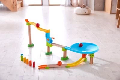Diese lustige „Kugelstau“-Kugelbahn aus der „Kullerbü“-Kollektion von Haba lässt Kinderherzen höherschlagen! Die bunte Bahn begeistert mit vielen verschiedenen Funktionen und sorgt für jede Menge Unterhaltung. Die Kugeln werden auf den Startpunkt gesetzt und rollen in die Röhre – doch dort bleiben sie stecken! Erst wenn man den Hebel betätigt, können die bunten Kugeln weiter in den Strudel flitzen. Von dort plumpsen sie eine Etage nach unten und rollen um die Kurve auf die Dominosteine zu. Sind die Kugeln angekommen, beginnt der Spaß von vorn!