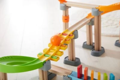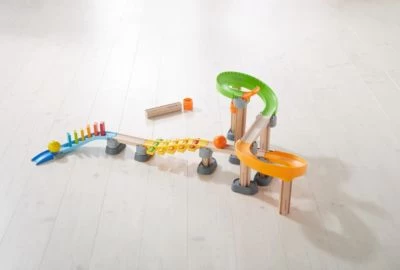 Die Kuller-Kugeln finden immer den richtigen Ton auf der HABA Kugelbahn Melodie-Domino. Mit spannenden Effekten begeistert die Kullerbü-Kugelbahn Kinder ab 2 Jahren. Kullern die Kugeln über die Klangtreppe, erklingt eine kleine Melodie. Auch Fahrzeuge können die Klangtreppe befahren. Für extra viel Schwung sorgen zwei große Steilkurven. Auf der Dominotreppe stehen schon die bunten Holz-Steine bereit. Mit Getöse wirft die Kuller-Kugel die Dominosteine um! Das Set Melodie-Domino ist mit allen Kullerbü-Kugelbahnen kombinierbar für kreativen Bau- und Kuller-Spaß mit HABA.