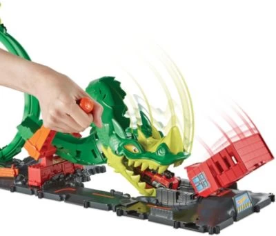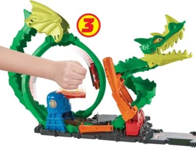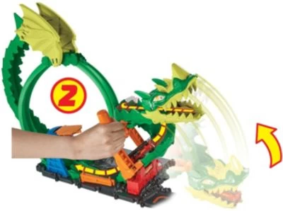 Bei der Hot Wheels Feuerwache ist so einiges los! Drache „Dante“ greift an und zerstört die Feuerwehrwache und verschlingt die Fahrzeuge. Mit dem Spieleset Hot Wheels City Dragon Drive Firefight von Mattel kommt rasante Racing- und Battle-Action in die Kinderzimmer. Mit dem Starter bekommt das beiliegende Hot Wheels Fahrzeug so richtig Schwung, um durch den Drachen einen Looping zu drehen und dann, mit etwas Geschick auf seinem Kopf zu landen. Wird der Drache Dante so außer Gefecht gesetzt? Cooler Rennspaß mit einem ganz besonderen Track, der sich mit allen anderen Hot Wheels Sets und Tracks verbinden lässt.