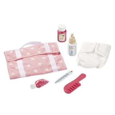 Wickeltasche von howa im schicken Sternedesign mit Windel aus Stoff, Nuckelflasche, Kamm, Cremetube, Puderdose, Thermometer aus Holz. Ideal kombinierbar mit unserem Puppenwickeltisch 2740. Die Windel ist für Puppen bis 50 cm geeignet.