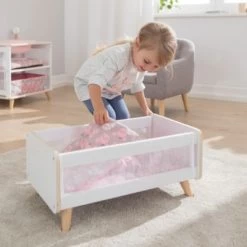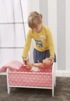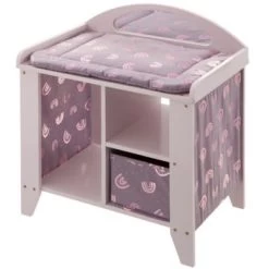 Auf dem Wickeltisch können die Puppenmamas ihre Lieblinge auf der gepolsterten Wickelauflage wickeln. Utensilien und Kleidung für die Puppen werden im passenden Korb, im Regalfach oder auf dem Kleiderbügel verstaut.