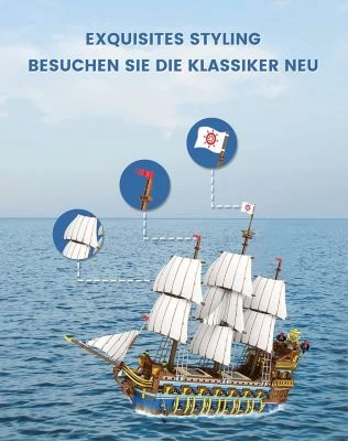 • Detailliertes Piratenschiff mit weißen Segeln aus Klemmbausteinen. Ideal fuer kleine und große Entdecker zum spielen oder dekorieren.