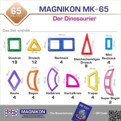 Das große Spielset besteht aus 65 Bausteinen. Sie bestehen aus hochwertigem Kunststoff, der speziell von japanischen Wissenschaftlern entwickelt wurde. Das Material ist ungiftig, umweltfreundlich, schadet weder der Gesundheit noch der Umwelt.Das Spielzeug ist für Kinder im Vorschulalter (3-5 Jahre) gedacht, aber auch Ältere könnten daran interessiert sein. MK-65 widmet sich einem der Lieblingsthemen von Kindern – prähistorische Kreaturen. Mit bunten Magnetelementen des Bausets können Kinder dreidimensionale Dinosaurierfiguren mit ihren eigenen Händen zusammenbauen: