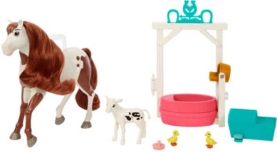 Für alle Spirit- und Pferde-Fans kommt mit diesem Puppenset „Spirit Tier-Abenteuer Pferd Boomerang & Zubehör“ von Mattel die passende Spielebegleitung in die Kinderzimmer. Mit den bezaubernden Spielefiguren können Pferde-Begeisterten die Abenteuer rund um den Zeichentrickfilm „Spirit – frei und ungezähmt“ von DreamWorks nachspielen oder eigene Geschichten erfinden. Pferd Boomerang hat sich am Brunnen mit den kleinen Küken und dem Kälbchen verabredet. Mit dem Huf kann Boomerang den Knopf für die Klappe der Kiste bedienen und die Küken können aussteigen. Werden sie im Brunnen schwimmen?
