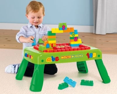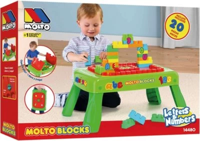 Dieser klappbare Tisch aus dem Hause Molto bietet kleinen Baumeister*innen großen Spaß! Die zwanzig mitgelieferten Bausteine werden unter einer Klappe im Tisch aufbewahrt. Wird der Tisch aufgestellt, holt man die Bausteine heraus und kann damit auf dem Tisch große Türme und vieles mehr errichten.