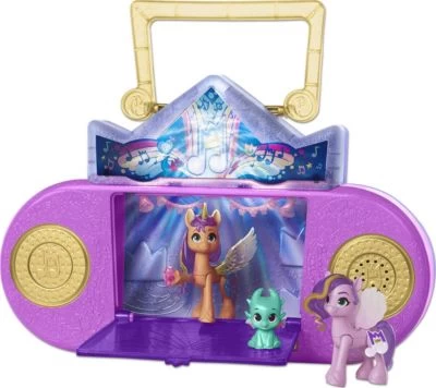 Das Zaubermelodie Radio ist ein 2-in-1 Spielset mit Lichtern und Geräuschen, die von den Ponys aktiviert werden. Auf der einen Seite befindet sich ein Salon mit einem Mähnenföhn, einer Garderobe für Accessoires und einem Regenbogenspielgel zum fantasievollen Spielen. Wird die andere Seite des Spielsets geöffnet, kommt eine Karaokebühne mit Lichtern und Sounds zum Vorschein. Um die Musik zu aktivieren, muss nur der Play-Knopf gedrückt oder ein Pony auf die Bühne gestellt werden. Jedes Pony aktiviert eigene Lichter und Musik! Enthält die 7,5 cm großen Sunny Starscout und Prinzessin Petals Ponyfiguren und den Babydrachen Sparky Sparkeroni.