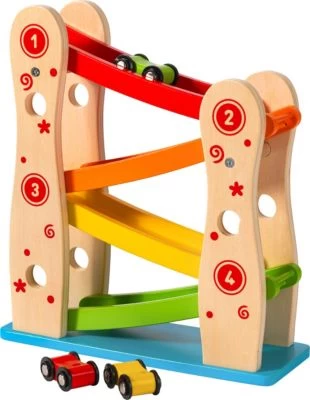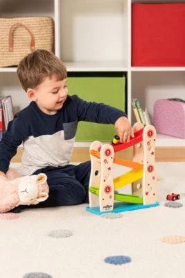 Die stabile Auto-Rollbahn mit drei Autos von myToys macht gute Laune! Da flitzen die kleinen Autos von der obersten Etage im coolen Zick-Zack-Kurs bis ganz nach unten. Nach den Fahrzeugen greifen und sie gezielt auf die Bahn setzen schult die Hand-Augen-Koordination und die Feinmotorik der Kleinen ganz nebenbei. Auch einzeln bespielt sorgen die Autos für Unterhaltung. Dank hochwertiger Verarbeitung werden Kleinkinder lange Freude an diesem Spielzeug haben.