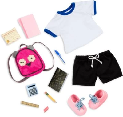 Inhalt: 1 Puppe, 1 Polo-Shirt, 1 Faltenrock, 1 Paar Socken, 1 Paar Schuhe, 1 Rucksack, 1 T-Shirt, 1 Paar Turnschuhe, 1 Unterhose, 1 kurze Hose, 1 Ordner, 1 Heft, 1 Zertifikat, 1 Bleistift, 1 Lineal, 1 Radiergummi, 1 Stift, 1 Taschenrechner