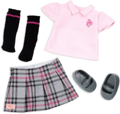 Folge deinem Glück mit Hally, der Schulpuppe von Our Generation! Sie hat strahlend blaue Augen, die sich öffnen und schließen, und ihr langes blondes Haar ist zu zwei Zöpfen geflochten. Du kannst es aber auch zu anderen Frisuren stylen. Hally trägt ihre Schuluniform, bestehend aus einem rosa Polo-Shirt mit OG-Wappen, einem grauen Faltenrock mit Muster, Kniestrümpfen, passenden Schuhen und einen pinken, witzigen Rucksack. Hally hat ihre Sportkleidung gleich mit dabei, damit sie direkt im Sportunterricht mitmachen kann! Ein weißes T-Shirt, bequeme schwarze Shorts und rosa Turnschuhe sind dafür das perfekte Outfit. Beide Outfits sind leicht an- und auszuziehen, so dass es Spaß macht, Hally in ein anderes farbenfrohes Outfits von Our Generation zu stylen. Du wirst viel Spaß haben neue Styles für Halleys Schultage zu kreieren und sie dabei zu begleiten!