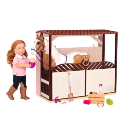 Um ihre vierbeinigen Freunde kümmern sich deine Puppen von Our Generation immer ganz besonders liebevoll. Mit diesem tollen Stall schenken sie ihren Pferden ein wundervolles neues Zuhause! Das Tor der Box lässt sich ganz einfach öffnen und schließen, damit die Pferde auch immer genug Auslauf bekommen. Ihr könnt sie striegeln und füttern, und natürlich gehört auch das Ausmisten dazu. Aber am schönsten ist es, wenn ihr euch in den Sattel schwingt und zusammen ausreitet. Nirgends ist es schöner als auf dem Rücken der Pferde!