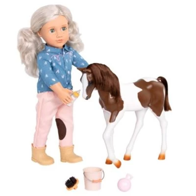 Ist es nicht wunderschön auf dem Land? Schau mal, wie liebevoll sich Yanira, unsere 46cm große Our Generation Puppe, um ihr Fohlen kümmert. Natürlich geht Yanira gerne reiten, aber dafür ist das Fohlen mit seinen 30cm noch zu klein. Damit es glücklich und gesund bleibt, müsst ihr es natürlich regelmäßig füttern. Ist das nicht süß, wie es an der Flasche nuckelt oder Hafer aus dem Futtereimer knabbert? Ihr könnt es auch bürsten und striegeln oder seine schöne braune Mähne flechten. Auch Yanira mag es, wenn du ihre schönen hellblonden Haare bürstest. Sie hat hellblaue Augen, die sich öffnen und schließen. Mit ihrer süßen Western-Bluse, der rosa Reithose und den coolen Stiefeln sieht sie fast schon aus wie ein richtiges Cowgirl. Yeehaw!