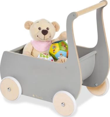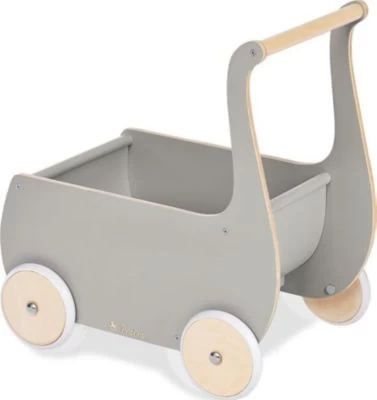 Puppenwagen ‚Mette‘, inkl. stufenlos einstellbarem Bremssystem, gummierten Holzrädern und Stahlachsen. Aus massiver Birke, grau lackiert, Maße L 46 x B 34 x H 50 cm, Schiebegriff H 50 cm, Gewicht 2 kg, mit CE-Kennzeichnung, Teilmontage erforderlich Das durchdachte Bremssystem hilft die ersten noch unsicheren Gehversuche gut zu meistern. Die Bremswirkung lässt sich durch die Bremsstange aus Rundstahl mit Kunststoff-Endkappen ganz einfach stufenlos und werkzeugfrei einstellen Im Puppenwagen finden die wichtigsten Spielsachen und Puppenlieblinge Platz, die man auf einer Erkundungstour braucht. Die Lauflernhilfe ist für Mädchen und Jungs von 1 bis 6 Jahren geeignet Der stabile und robuste Puppenwagen ‚Mette‘ bietet deinem Kind einen sicheren Stand, wodurch es problemlos Laufen lernen kann. Der Wagen ist eine tolle Geschenkidee zum Geburtstag oder zu Weihnachten Pinolino erfüllt seit 1997 Kinderträume und vertreibt Kindermöbel, Accessoires und Spielwaren. Das deutsche Unternehmen verwendet nur für Kinder geeignete Lacke, Lasuren und Öle, ist Mitglied im DVSI und gewährt 10 Jahre Pinolino-Plus-Garantie
