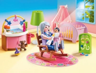 Zubehör: 1 Babybett, 1 Stoffdecke, 1 Wickelkommode mit Spielbogen, 1 Stehlampe, 1 Schaukelstuhl, 1 Teppich, 1 Mülleimer, 1 Töpfchen, 1 Motorikspielzeug, 1 Stehauffigur, 1 Teddybär, 1 Babylatz, 1 Babyflasche, 2 Gläser, 1 Kosmetikflasche, 1 Tube, 2 Sets Babyspielzeug (2-teilig)