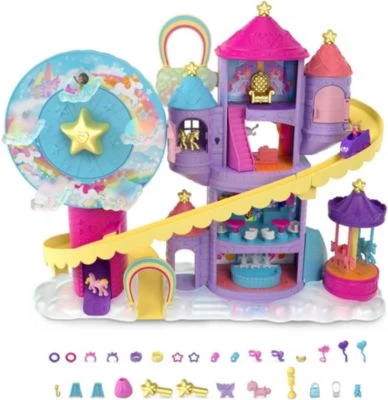 Mit dem zauberhaften Polly Pocket Pollyville Regenbogen-Einhornspaß-Freizeitpark sind der Fantasie keine Grenzen gesetzt! Der große Park besteht aus drei verschiedenen Attraktionen, sieben Spielbereichen und 25 tollen Überraschungen. Mit dabei sind natürlich auch eine kleine Polly Puppe sowie eine kleine Shani Puppe und zwei Einhörner.