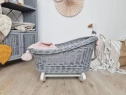 TinaForKids Puppenwiege Aus Weiden Mit Bettwäscheset, Puppenbett Grau/Rosa