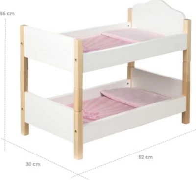 Das roba „Scarlett“ Puppenetagenbett, weiß lackiert im klassischen Landhauslook, bietet genügend Platz für zwei Puppen oder Babypuppen deines Kindes. Das Etagenbett in Weiß für Puppen ist mit zwei Bettwäschen (2x Kissen, 2x Decken) ausgestattet. Die textile Ausstattung ist mit liebevollem Kronenmotiv bedruckt und lädt zum fröhlichen Träumen und Kuscheln ein. Das Puppenetagenbett ist teilbar und lässt sich einfach in zwei einzelne Puppenbetten verwandeln. Das Etagenbett wird zerlegt geliefert. Die Montage ist leicht. Die Oberflächen sind abwischbar und pflegeleicht, die textile Ausstattung ist in der Maschine waschbar.