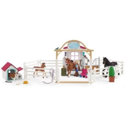 Das kleine Fohlen freut sich schon riesig, dass der Ausflug zur neuen Pferdekoppel bald losgeht! Jetzt muss die Pflegerin Betty nur noch die Appaloosa Stute striegeln und in eine warme Pferdecke wickeln, dann können sie schon starten. Der Stallbursche Tim schaut, dass sie genug leckere Äpfel und Heu für die Fahrt dabei haben. Die Hündin Ruby ist auch schon ganz aufgeregt und wartet ungeduldig auf den Pick-Up. Die Friesenstute Raja frisst derweil gemütlich ihre Karotten, bis ihre zwei Freunde wieder zurück sind. Die Schleich® Figuren sind detailgetreu modelliert und stehen für pädagogisch wertvolles Spielen. Der Artikel gehört zur Themenwelt Horse Club und ist für Kinder zwischen 5-12 Jahren geeignet. Paddocks sind kombinierbar mit vielen weiteren Schleich® Produkten! Viele bewegliche Teile! Inhalt: 1x Appaloosa Stute, 1x Fohlen, 1x Hündin Ruby, 1x Hundehütte, 8x Paddocks, 1x Eingangstor, 1x Fohlendecke, 3x Stallhalfter, 1x Obstkiste, 1x Äpfel rot, 1x Raufe, 1x Eimer, 1x Buchsbaum, 1x Knochen, 1x Stock, 1x Hundenapf, 1x Hundehalsband, 1x Pick-up, 1x Fahrer, 1x Anhänger, 1x Sattel, 1x Zaumzeug, 1x Friese Stute, 1x Pferdedecke, 1x Strohballen, 2x Karotten, 1x Pferdebox, 1x Pferdepflegerin, 1 x Pferdebox Schild, 1 x Raufe, 1 x Tränke, 1 x Putzkiste, 1 x Kardätsche, 1 x Striegel, magenta, 1 x Haftbandage, 1 x Medikamentenflasche , 1 x Salbe, 1 x Siegerschleife, lila, 1 x Siegerschleife, türkis, 1 x Stickerbogen, 1 x Aufbauanleitung
