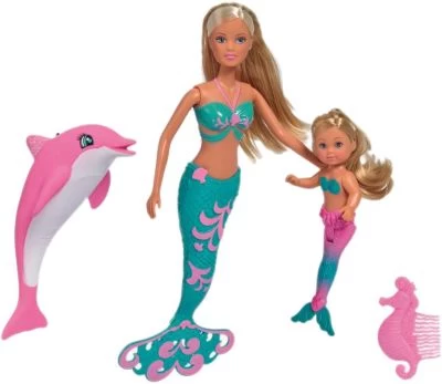 Die Steffi LOVE Mermaid Friends erkunden zusammen die Unterwasserwelt. Als wunderschöne Meerjungfrauen schwimmen Steffi und die kleine Evi mit ihrem Freund dem rosa Delfin um die Wette. Im Set ist zudem ein süßes Seepferdchen als Kamm enthalten mit dem man die Haare der zwei Schwestern kämmen kann. Die Steffi LOVE Mermaid Friends von Simba Toys sind für Kinder ab 3 Jahren geeignet.