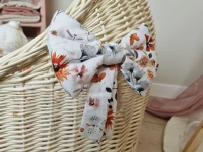 Farbe: Natur/Weiß, mit einem weiß geblümten Bettwäscheset (Kissen und Decke) und Stoffschleife