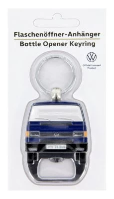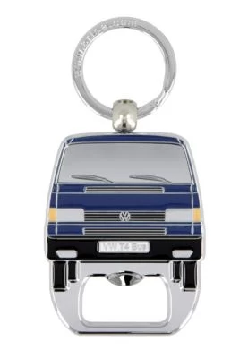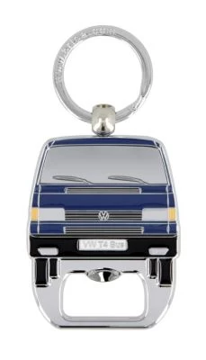 Die Form des Anhängers ist eine detaillierte Darstellung der Front eines Volkswagen T4 Busses in blau. Der VW T4 ist ein legendäres Auto, das als Bindeglied zwischen dem Vintage Stil der originalen T1 Bulli Busse und der Moderne heutiger Neuwägen dient. Das ausdrucksvolle Design des Transporters spiegelt sich perfekt im Look des Schlüsselanhängers wider und ist bestimmt ein Hit auf jeder Party, wenn Getränke ausgegeben werden.