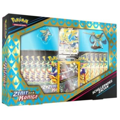 Pokémon – Sammelkarten-Spiel – Schillerndes Zacian – Premium-Figuren-Kollektion Schillernde Legendäre Pokemon gehören zu den begehrtesten Pokemon überhaupt und jetzt kannst du Zacian deiner Sammlung als Schillerndes Pokemon-V hinzufügen! Mit einer Fähigkeiten, die Energie ins Spiel bringt, kann dir Zacian-V einen Vorsprung verschaffen, während seine ungewohnte türkis-goldene Färbung königliche Stärke ausstrahlt. Schillerndes Zacian – Premium-Figuren-Kollektion enthält: 1x geprägte holografische Promokarte mit Schillerndes Zacian-V 1x Figur von Schillerndes Zacian 1x Sammler-Pin mit Schillerndes Zacian 65 Kartenhüllen mit Schillerndes Zacian und Schillerndes Zamazenta 11x Boosterpacks der Pokémon-Sammelkartenspiel-Erweiterung Zenit der Könige 1x Code-Karte für das Pokémon-Sammelkartenspiel-Live Altersempfehlung vom Hersteller: Geeignet für Kinder ab 6 Jahren! Sprache: Deutsch Größe Verpackung: Länge 33,5 cm x Breite 6,0 cm x Höhe 22,5 cm Warnhinweise des Herstellers: Achtung! Nicht geeignet für Kinder unter 36 Monaten! Artikel enthält (besteht aus) Kleinteilen, die verschluckt werden könnten. Erstickungsgefahr! Bitte entfernen Sie das gesamte Verpackungsmaterial, angenähte Etiketten und deren Befestigungsteile bevor Sie den Artikel Ihrem Kind übergeben! Hinweistexte und Herstellerdaten auf der Verpackung heben Sie bitte zur späteren Einsichtnahme auf!